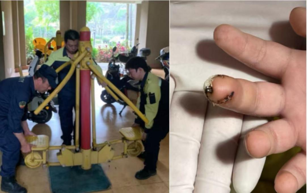 2024年4月,东莞2岁男童在玩双人坐拉训练器时,手指被下方凳子夹伤(图1)。